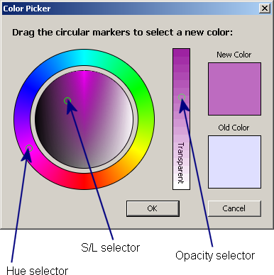 The color picker is a dialog with three, circular controls. These controls may be adjusted with the mouse by clicking and dragging them to a new position.