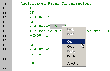 Additionally, the editor lets you select entire lines by clicking on the line number. Selected text regions can be dragged with a left-click of the mouse. Right-clicking on the text pulls up a pop-up menu giving you quick access to the Edit menu options.
