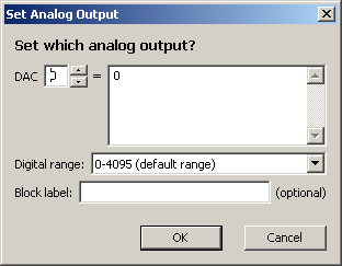 The spin-control in the dialog's upper-left selects which output will be set. Use 0 to set analog output AO1, 1 to set AO2, etc. The index number always begins counting at 0 for consistency with the C standard.