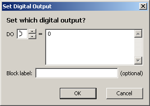 The spin-control in the dialog's upper-left sets which output will be set. Use 0 to set digital output DO1, 1 to set DO2, etc. The index number always begins counting at 0 for consistency with the C standard.