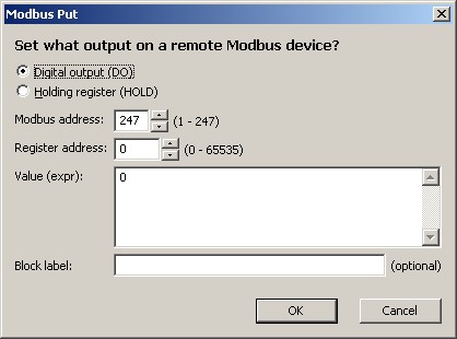 Modbus put blocks allow you to write a value to another Modbus device. Each Modbus put block can write to a single digital output or holding register.