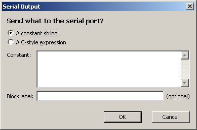The large text-control in the dialog's middle sets the string to be output. If you have selected the constant string option, then the value in this box will be sent out the serial port exactly. If you have selected the C-style string expression option, then the text-control must contain a valid string expression that will be processed when the program's execution reaches the block.