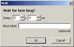 The wait dialog allows you to enter the delay amount. Use the two spin controls to enter the delay in seconds and milliseconds.
