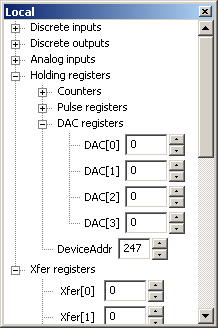 The local panel allows you to inspect and modify the RIO device's local ports such as DIs, DOs, and various holding registers. The local ports are arranged in a tree structure; the branches of which can be expanded or collapsed with the click of a mouse. Recently modified values are highlighted in bold.