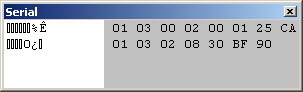The serial panel tracks serial data sent and received over the RIO device's serial port. The left side of this panel represents this data as text and the right portion is represented as hexidecimal bytes.
