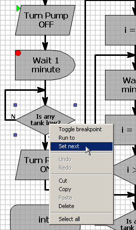 The "Set next" option on the Debug menu moves the execution pointer (the green triangle) to the selected line or object. This is a handy way to test another execution path.