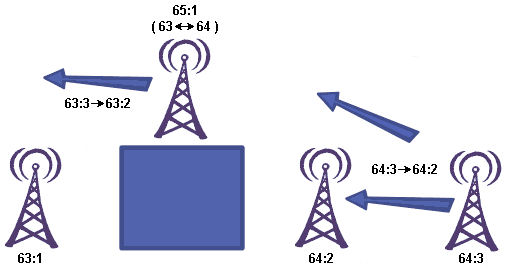 Suppose radio 63:1 needs to send a message to 64:2. Instead of designating 64:2 as the message target, the western radio would address the message to 63:2. The relay would receive this message and rewrite the source and destination to indicate that the message came from 64:1 and is intended for 64:2. The relay would then retransmit the message from high above both sets of radios, and eastern radio 64:2 could now receive its data.