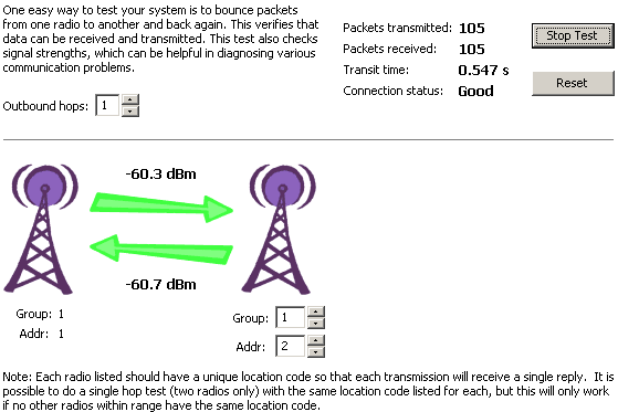 This handy test bounces small, test packets off a radio of your choice. To simplify the test, the packet bouncing test includes a return path in the header so the packets are bounced back automatically, without a need for user code running at the far end of the link. Additionally, this test requests and displays signal strengths of each transmission. The arrows are color-coded to indicate the signal strength.
